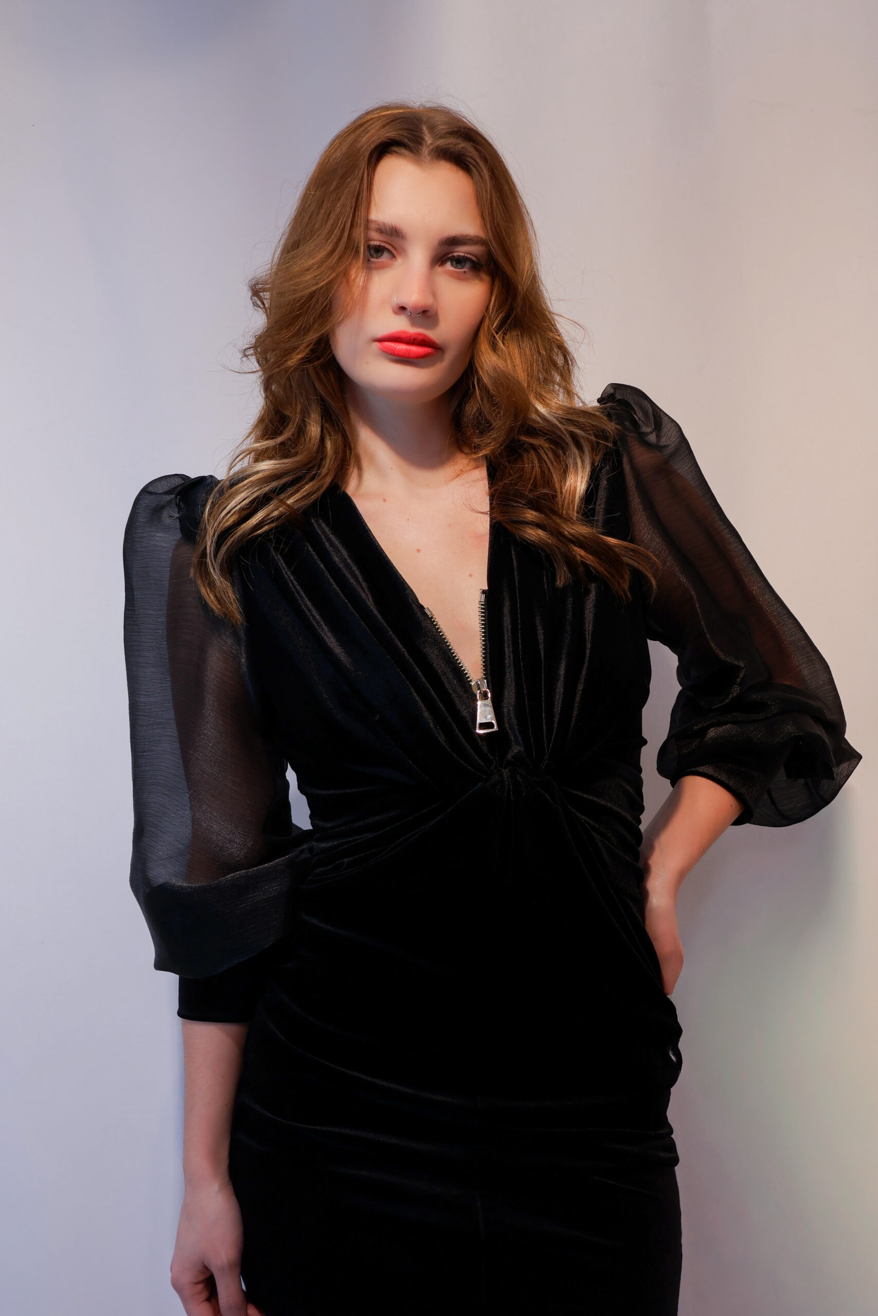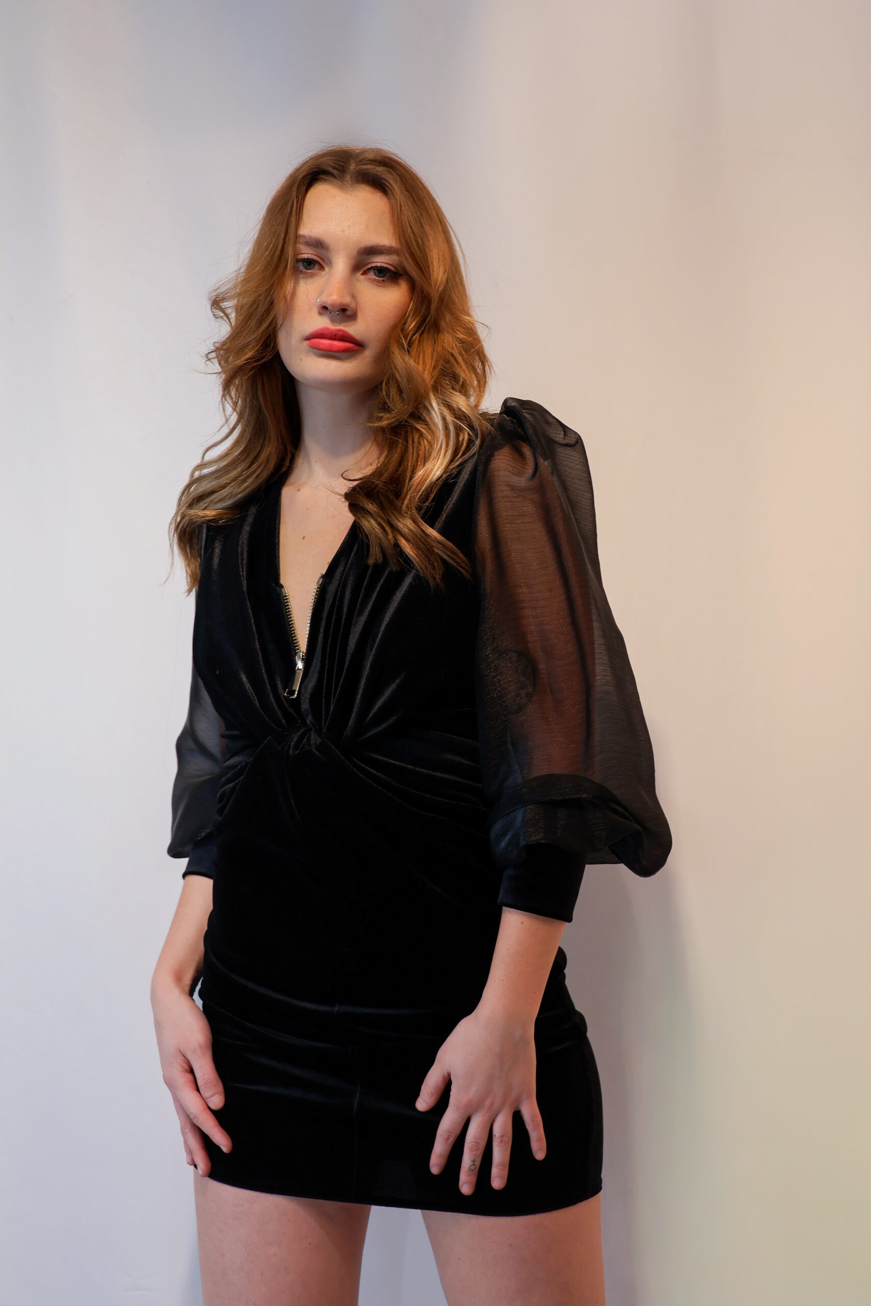 Dieses Kleid ist das ultimative Statement-Piece für besondere Nächte. Der tiefe Schwarzton des weichen Samts schmiegt sich perfekt an die Silhouette an, während die voluminösen Organza-Ärmel für einen Hauch Dramatik und Eleganz sorgen. Ein Look, der garantiert alle Blicke auf sich zieht.