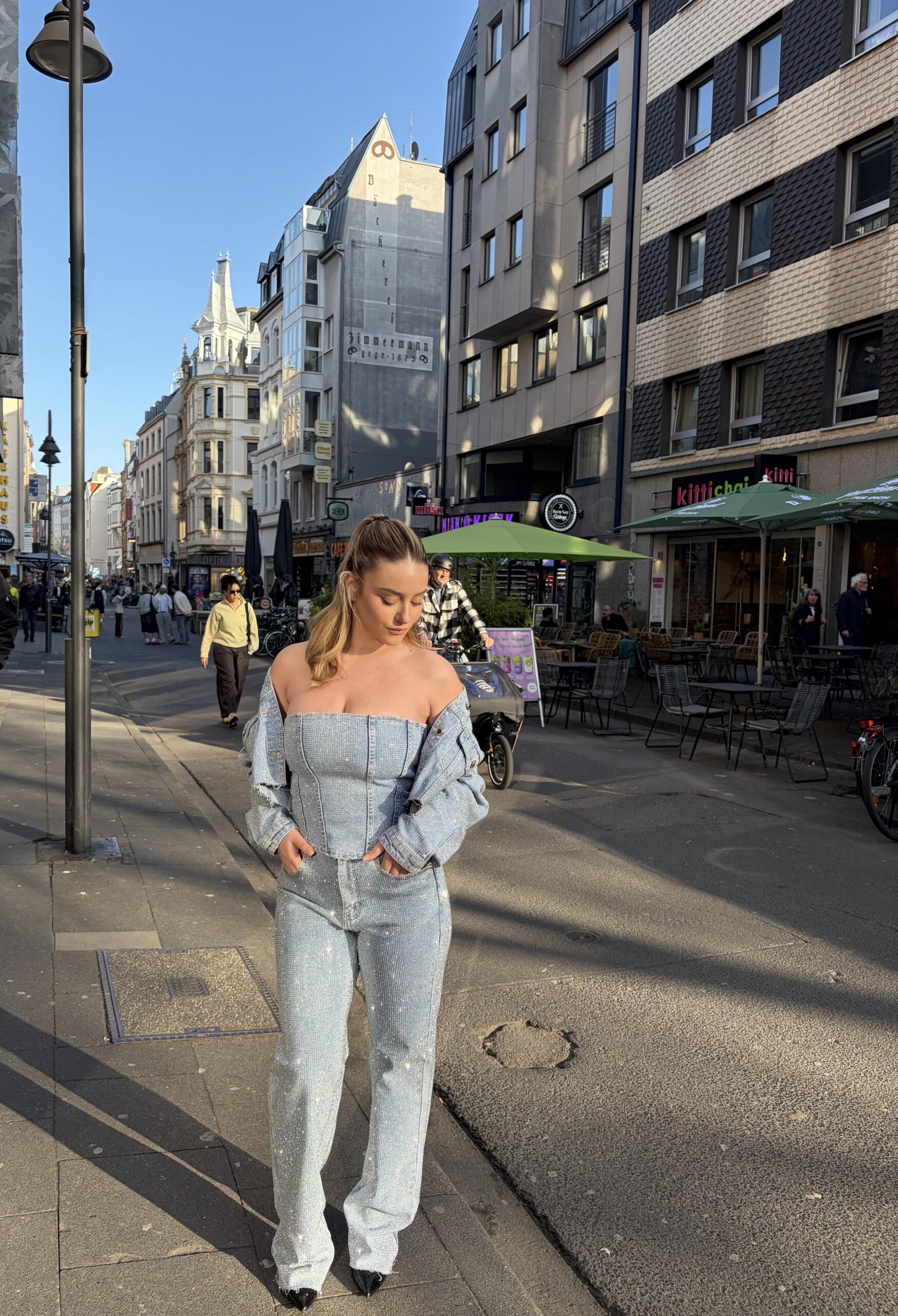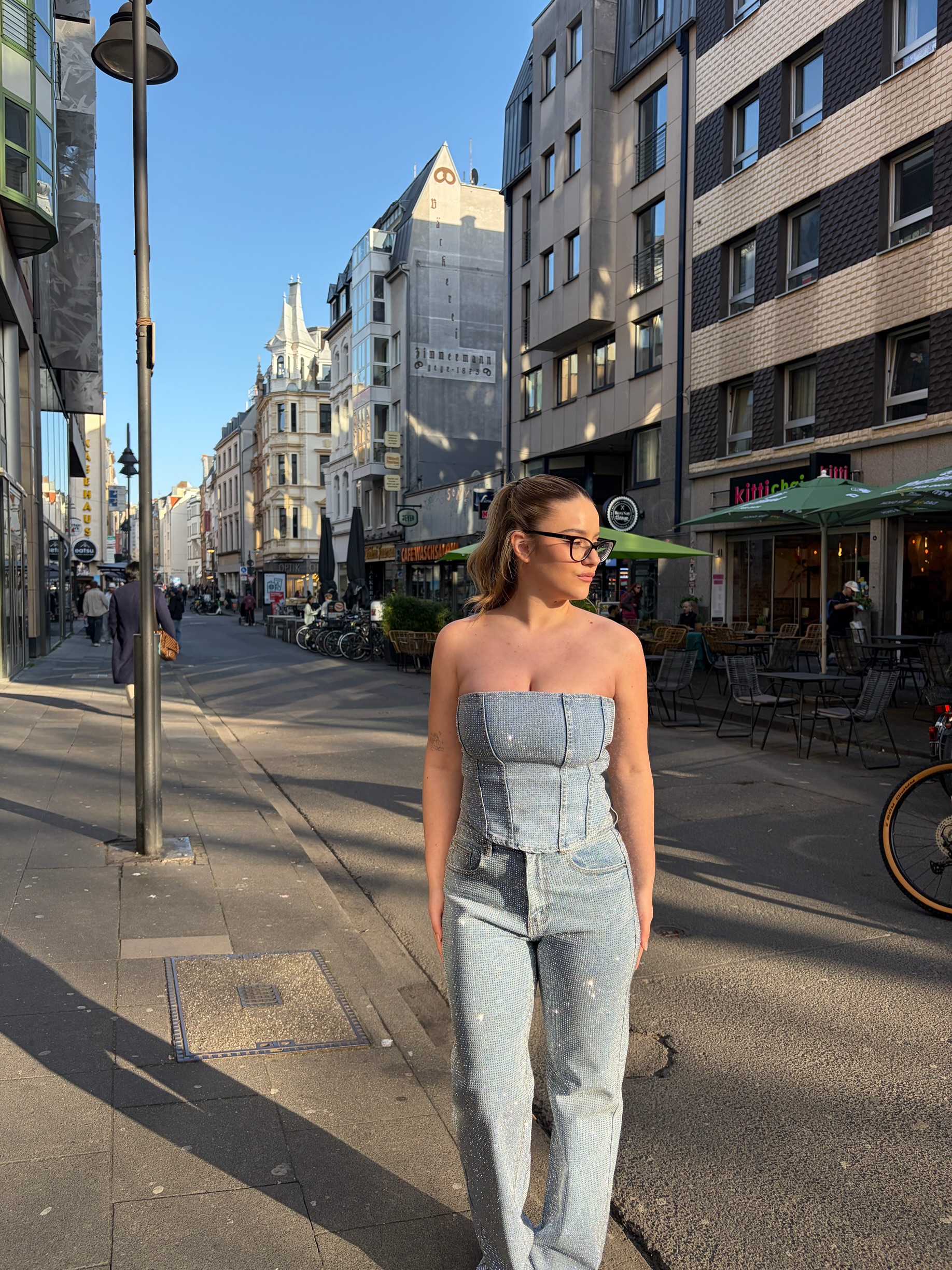 Stylisches Bustier Top aus Denim mit Glitzer. Figurbetonte Passform und moderner Look  perfekt für Partys, Events oder trendige Outfits.