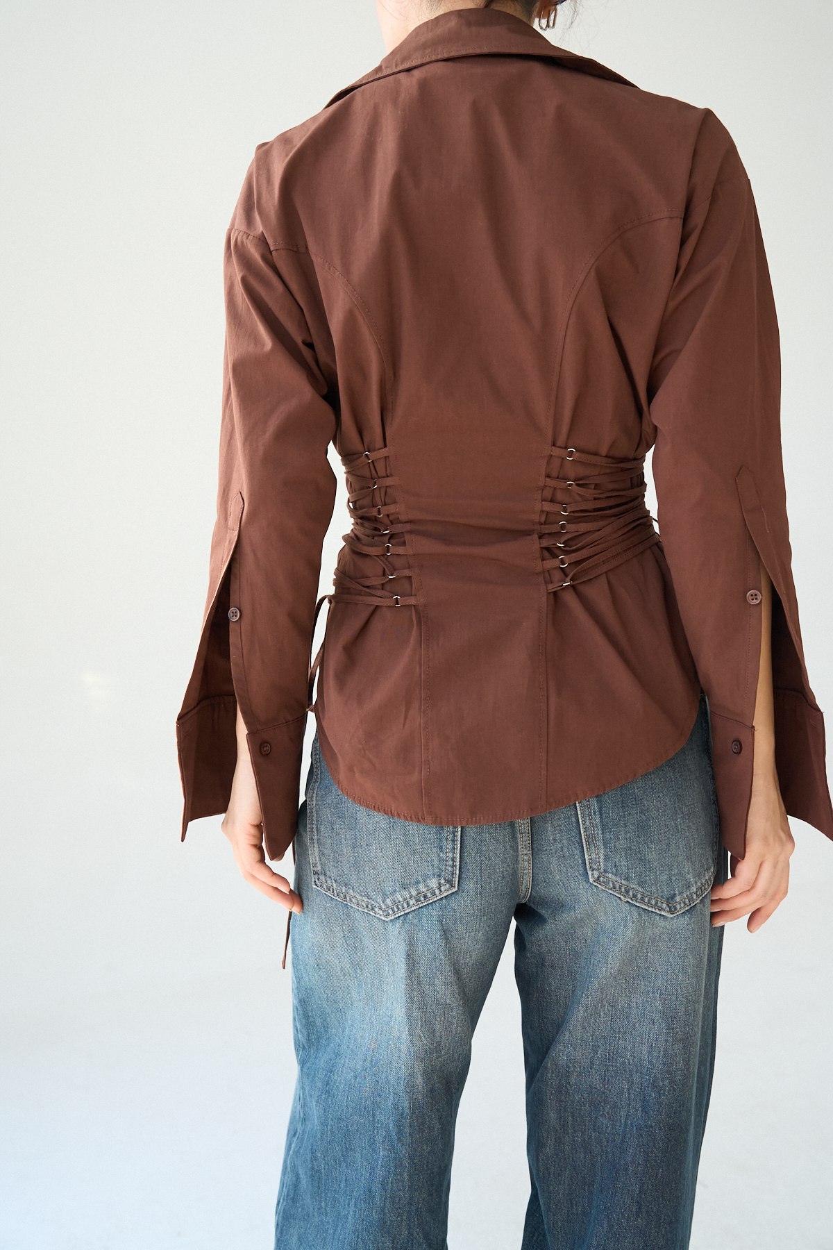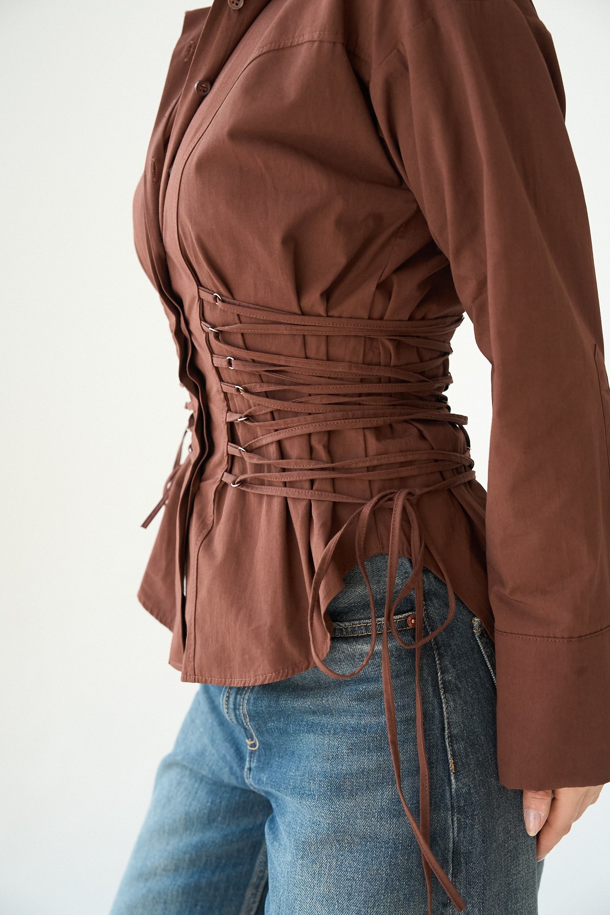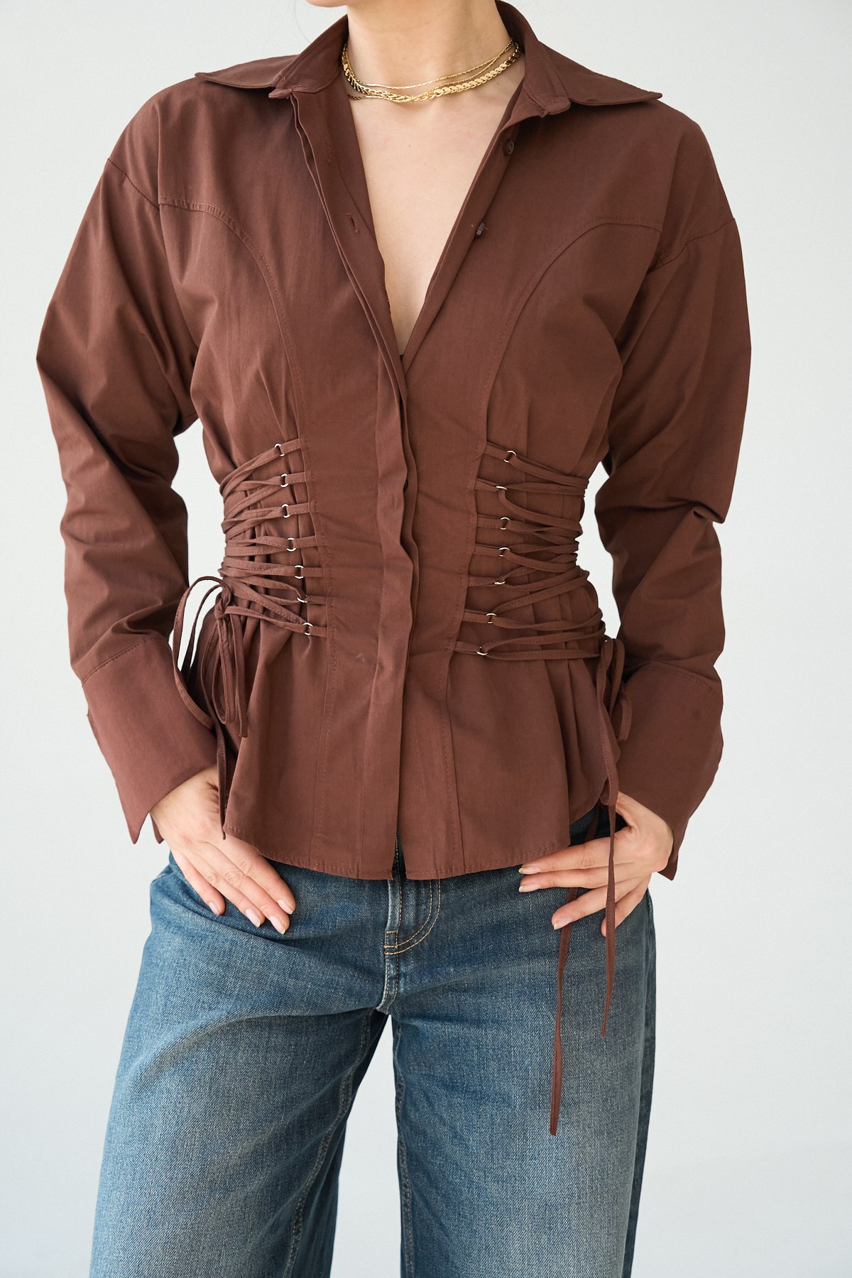 Diese stylische Hemdbluse in Schokobraun kombiniert klassischen Chic mit einem modernen Korsett-Detail. Dank der seitlichen Schnürung mit feinen Metallösen lässt sich die Taille individuell betonen und formt eine feminine Silhouette. Gefertigt aus hochwertiger Baumwollpopeline bietet sie eine figurbetonte Passform mit edlem Hemdkragen der ideale Partner für Blue Jeans oder Lederhosen.