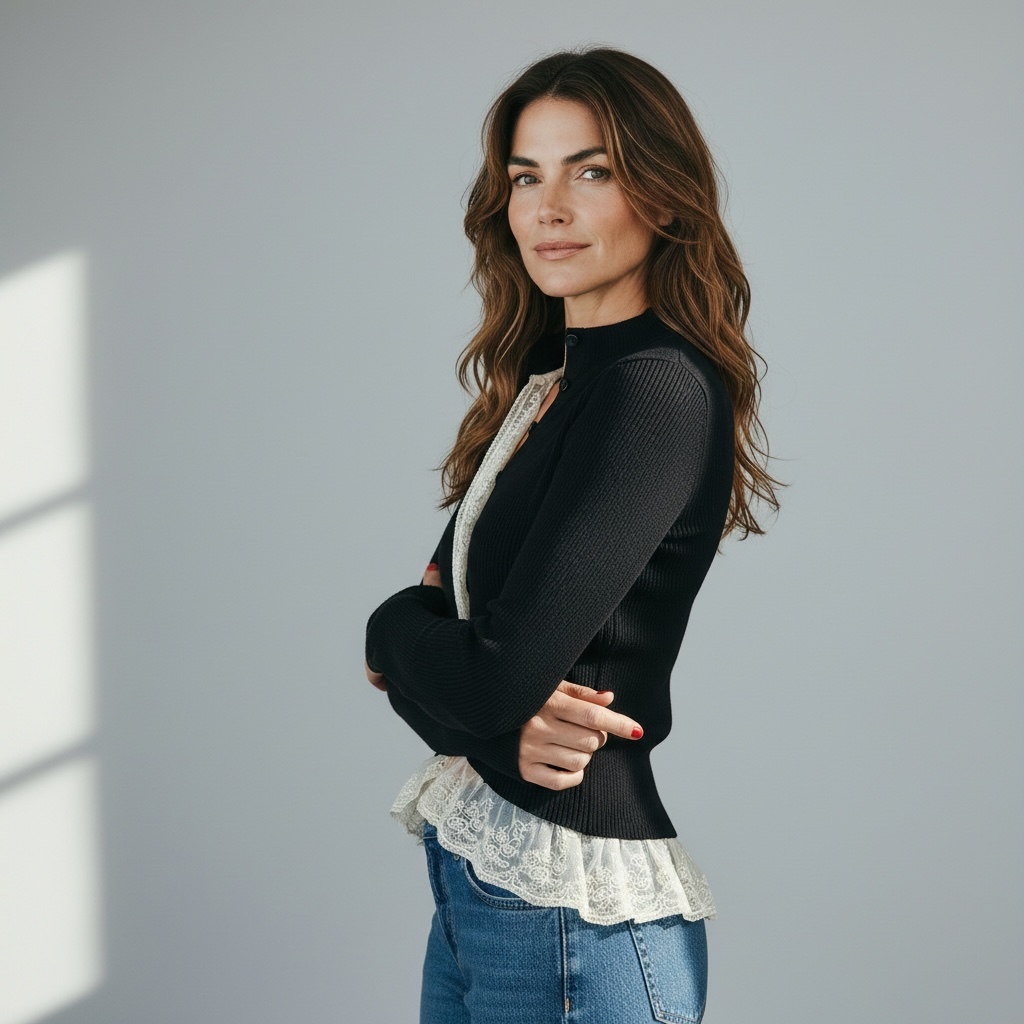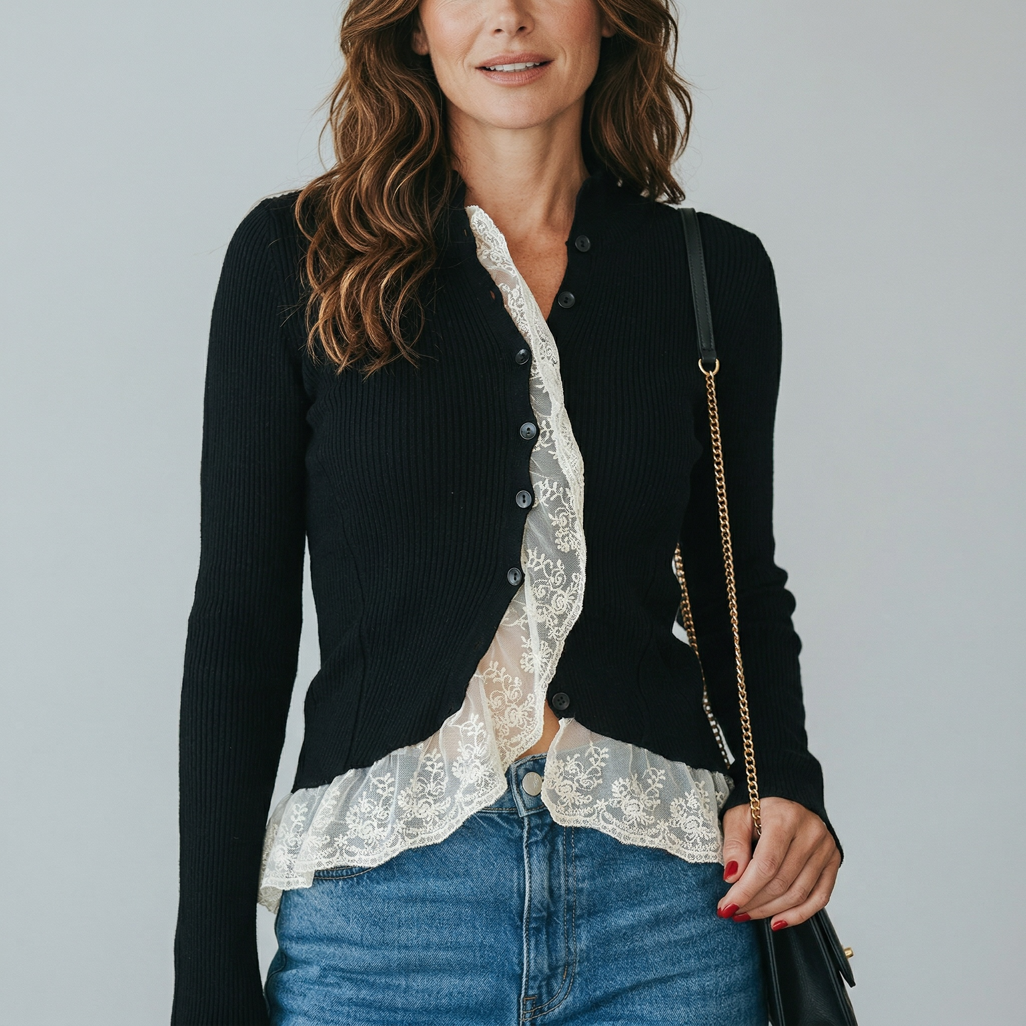 Diese elegante Strickjacke kombiniert eine moderne Rippstruktur mit femininen Details. Der filigrane Spitzenbesatz am Stehkragen und an den Ärmeln verleiht dem klassischen Design eine romantische Note. Dank der schmalen Passform und des weichen Feinstricks schmiegt sie sich perfekt an die Silhouette an ideal als edles Solostück oder für stilvolle Layering Looks.